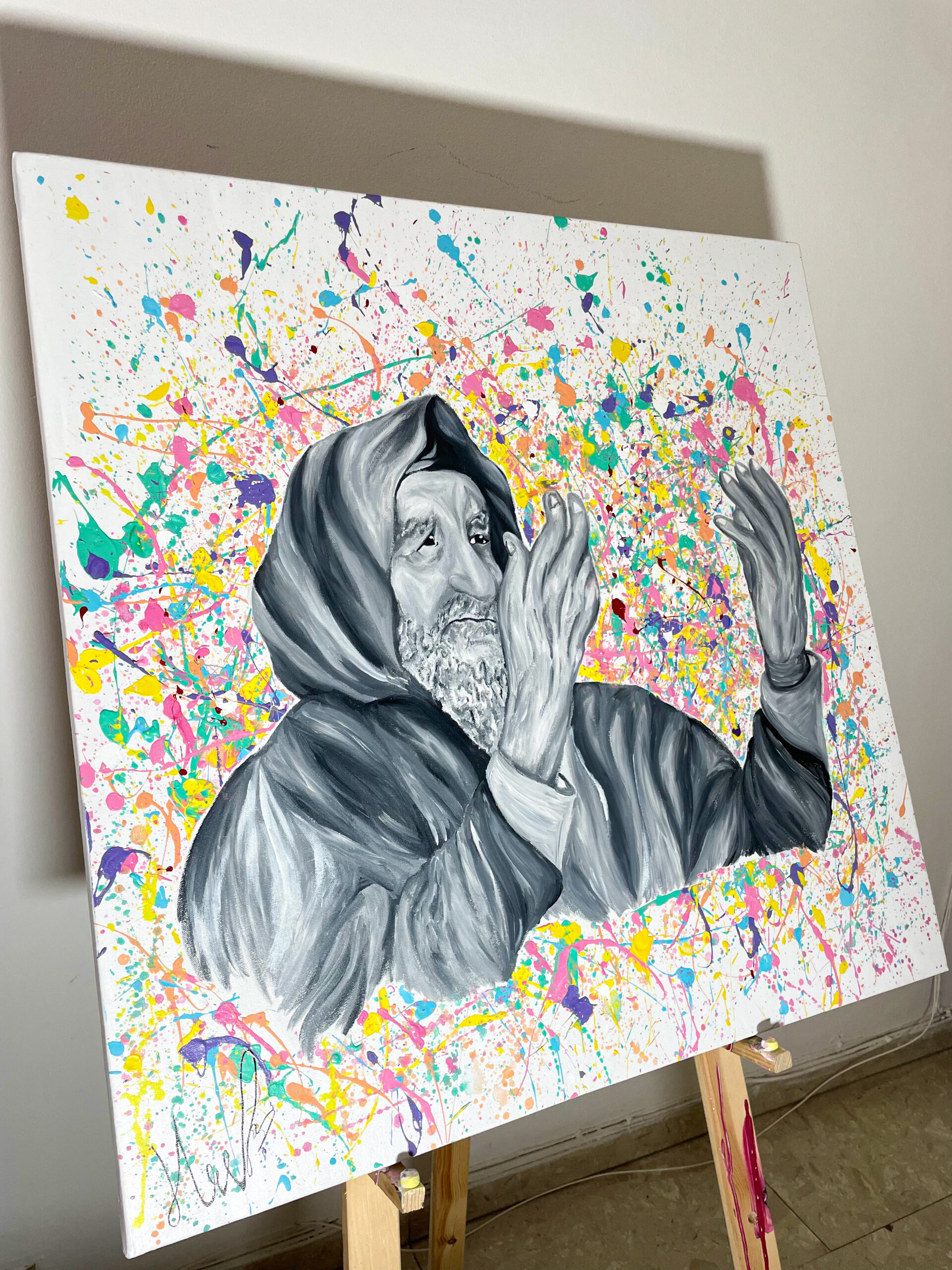 היצירה מציגה את הרב בשחור־לבן, מוקף שפריצי צבעים חיים שמוסיפים עומק, תנועה ואור.
